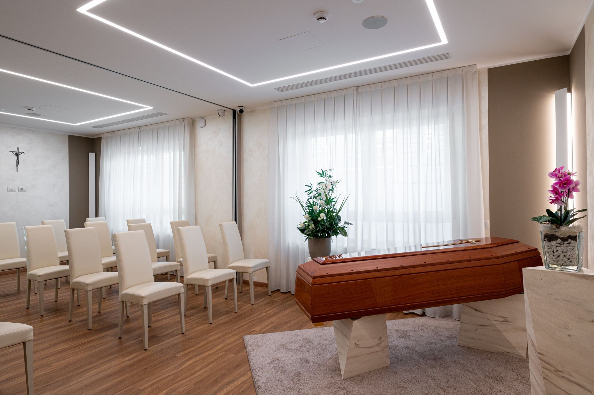 Anche in questo locale la cura dell’arredo è particolarmente ricercata, così da dare al momento del funerale la più confacente atmosfera di sacralità.